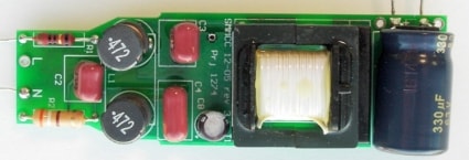 The PFC-flyback power converter operates in transition mode for the highest efficiency and best use of components. With the addition of a few extra components the HVLED815PF is made to draw near-sinusoidal input current from the AC line. The circuit regulates LED current over a wide range of line voltage and LED string voltage, and is dimmable with standard Triac-based dimmers.