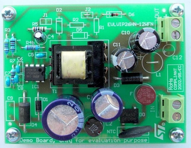 The STEVAL-ISA111V1 demonstration board is a 12 V, 1 A power supply set in non-isolated flyback topology using the VIPER26HN, the new offline high voltage converter by STMicroelectronics.