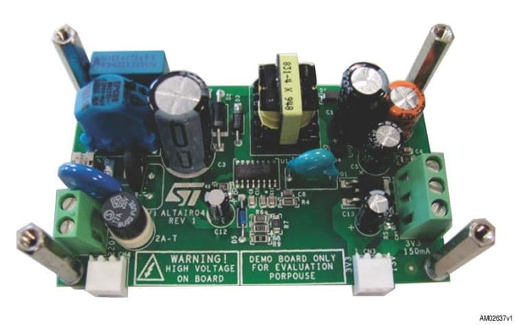 The STEVAL-ISA133V1 demonstration board uses the new ALTAIR04-900, a quasi-resonant (QR) current-mode controller IC specifically designed for QR ZVS (zero voltage switching at switch turn-on) flyback converters, which combines a high-performance low-voltage PWM controller chip and a typical 16 RDSon, 900 V, avalanche-rugged power MOSFET in the same package.