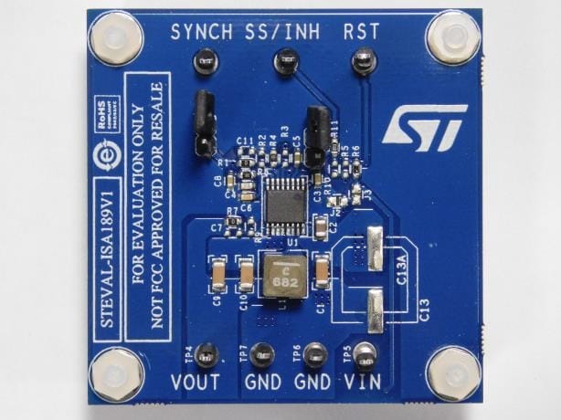 The STEVAL-ISA189V1 is a product evaluation board based on the ST synchronous step-down switching regulator A6986F5V, which can deliver up to 1.5 A and, with its 100% duty cycle ability to withstand cold crank events and wide input operating voltage range, represents the ideal choice for battery-powered automotive systems. Synchronous rectification helps achieve higher efficiency at full load as well as application compactness, while high-frequency switching (programmable up to 2 MHz) helps reduce the cost and size of power passive components while remaining outside the AM band. The device can operate in low consumption mode (LCM), with a quiescent current of 30 μA that ensures high efficiency under light load, which is a requirement in typical car body applications that are active when a car is parked. A low noise mode (LNM) can be selected to meet the requirements of infotainment applications with forced PWM mode under all load conditions. The default board configuration is LCM active, 500 kHz switching frequency, high ISKIP current and the switchover feature enabled, but all of these settings can be easily changed so the user can evaluate different application scenarios.