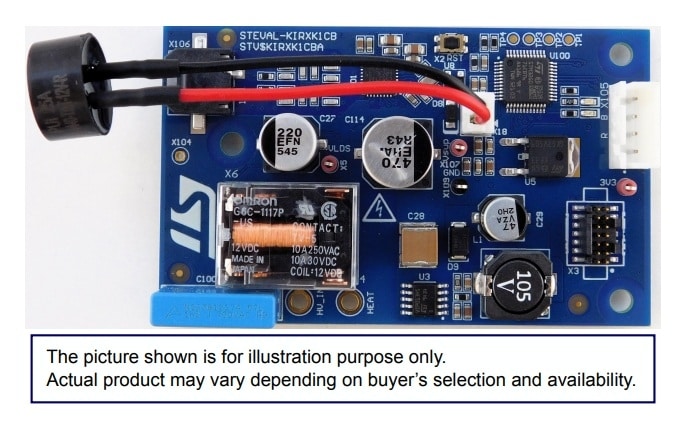 The STEVAL-KIRXK1CB is an evaluation board for Ki cordless kitchen receiver, specifically designed for water kettle appliances to be powered and controlled via a Ki wireless power transmitter (STEVAL-KITXCB).