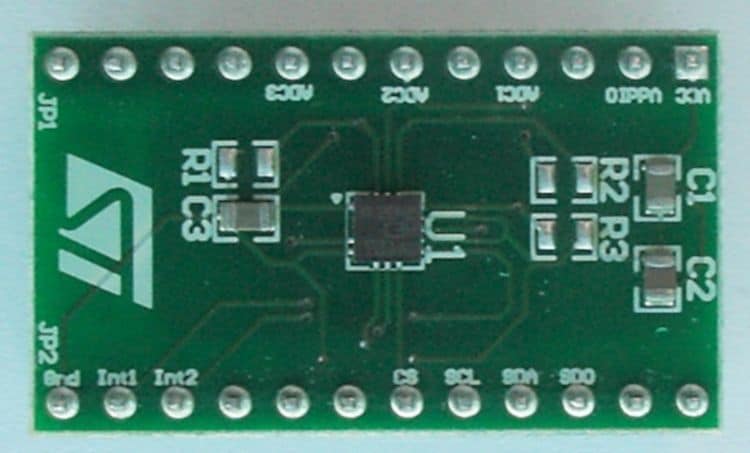 The STEVAL-MKI105V1 can be plugged into a standard DIL 24 socket. The adapter provides the complete LIS3DH pinout and comes ready-to-use with the required decoupling capacitors on the VDD power supply line.
