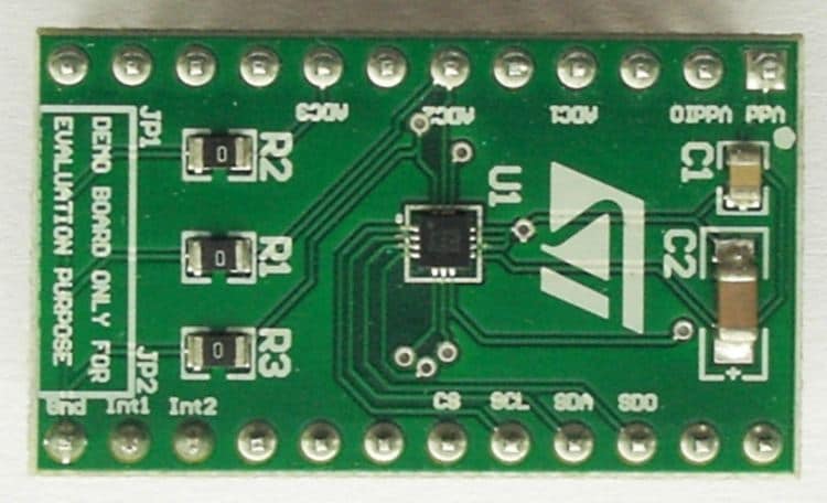 The STEVAL-MKI135V1 can be plugged into a standard DIL 24 socket. The adapter provides the complete LIS2DH pinout and comes ready-to-use with the required decoupling capacitors on the VDD power supply line.