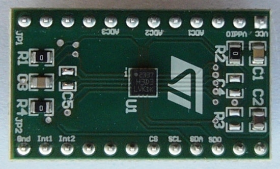 The STEVAL-MKI153V1 can be plugged into a standard DIL24 socket. The adapter provides the complete H3LIS331DL pinout and comes ready to use with the required decoupling capacitors on the VDD power supply line.