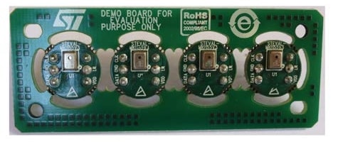 The STEVAL-MKI155V3 board is a daughterboard to be used with the STEVAL-MKI126Vx (Smart Voice) kit, containing 4 MP34DT01-M digital MEMS microphones.