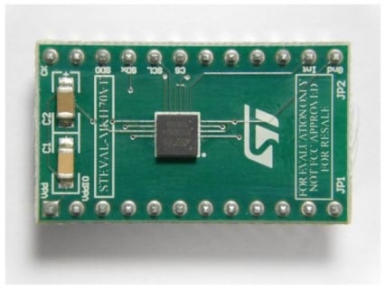 The STEVAL-MKI170V1 can be plugged into a standard DIL 24 socket. The adapter provides the complete IIS328DQ pin-out and comes ready-to-use with the required decoupling capacitors on the VDD power supply line.