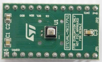 The STEVAL-MKI177V1 can be plugged into a standard DIL24 socket. The adapter provides the complete LPS35HW pin-out and comes ready-to-use with the required decoupling capacitors on the VDD power supply line.