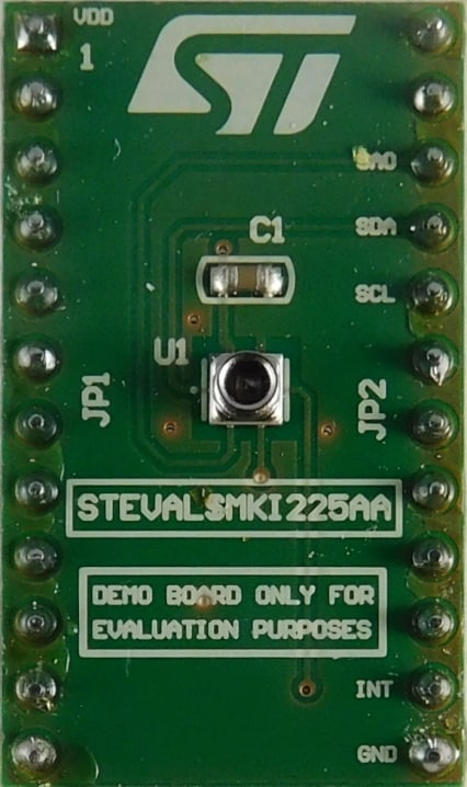 The STEVAL-MKI225A can be plugged into a standard DIL24 socket. The adapter provides the complete LPS28DFW pinout and comes ready to use with the required decoupling capacitors on the VDD power supply line.