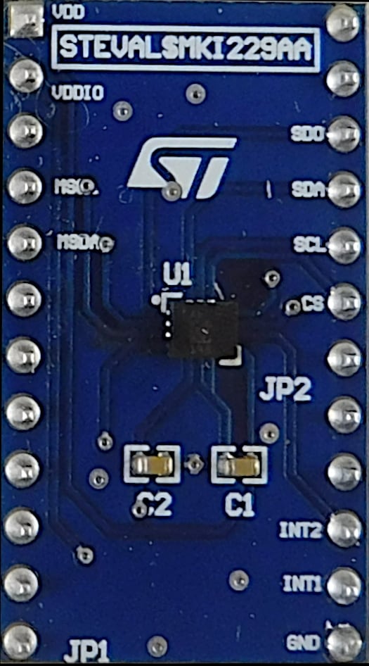The STEVAL-MKI229A can be plugged into a standard DIL24 socket. The adapter provides the complete LSM6DSO16IS pinout and comes ready to use with the required decoupling capacitors on the VDD power supply line.