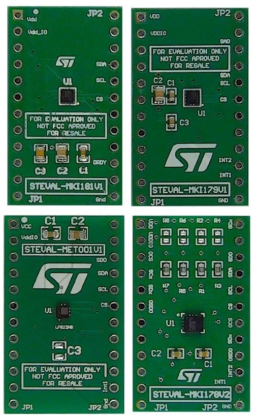 The STEVAL-MKIT01V1 is a MEMS sensor sample kit containing four sensor adapter boards that can be evaluated in standalone mode by simply connecting an I²C cable.