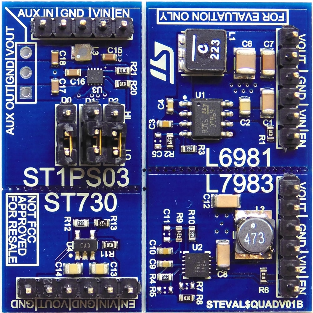 The STEVAL-QUADV01 evaluation board is based on the L6981 (capable of delivering up to 1.5 A DC), the L7983 (capable of delivering up to 300 mA DC), the ST1PS03 (capable of delivering up to 400 mA DC) synchronous monolithic step-down regulators, and the ST730 (capable of delivering up to 300 mA DC) LDO regulator.