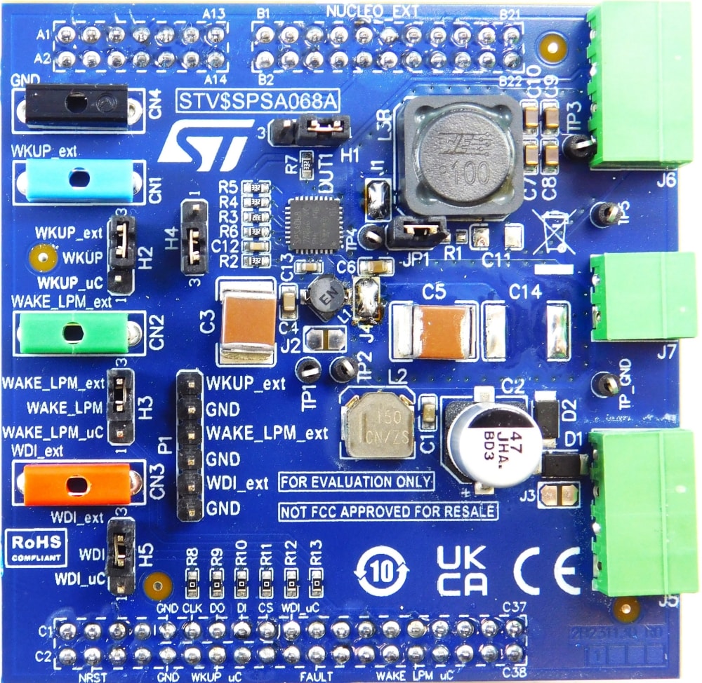 The STEVAL-SPSA068 is a tool designed to evaluate SPSA068, a BUCK voltage regulator with a precise voltage reference for automotive MCU applications. All the regulators have internal power switches.