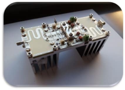 The demonstration board is a push-pull class AB power amplifier which uses a lumped L-C input/output network type on balanced microstrip lines.