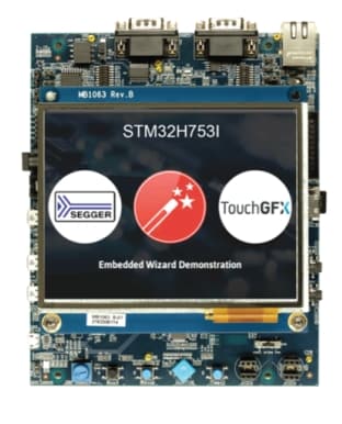 The full range of the STM32H7x3I-EVAL hardware features helps develop applications and evaluate all peripherals: USB OTG HS and OTG FS, Ethernet, CAN FD, USART, audio DAC and ADC, digital microphone, SRAM, SDRAM, NOR flash memory, twin Quad-SPI flash memory, microSD™ 3.0 card, 5.7” 640×480 TFT color LCD with touch panel, and cryptographic hardware accelerator (available only on STM32H753XI devices).