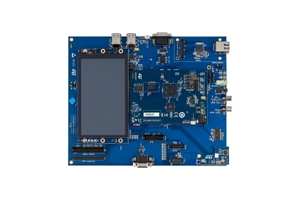 They include an ST-LINK embedded debug tool, LEDs, push-buttons, one joystick, 1-Gbps Ethernet, CAN FD, one USB OTG Micro-AB connector, four USB Host Type-A connectors, LCD display with touch panel, camera, stereo headset jack with analog microphone input, four digital microphones, one SPDIF Rx/Tx, smartcard, microSD™ card, and eMMC, NOR and NAND Flash memories.