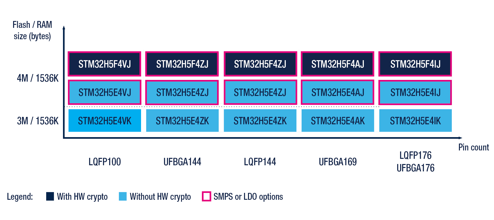 The STM32H5F4 adds a dedicated encryption accelerator engine (AES, PKA, and OTFDEC), and ST-iRoT, and support for the STM32Trust TEE Secure Manager (delivered as X-CUBE-SEC-M-H5).