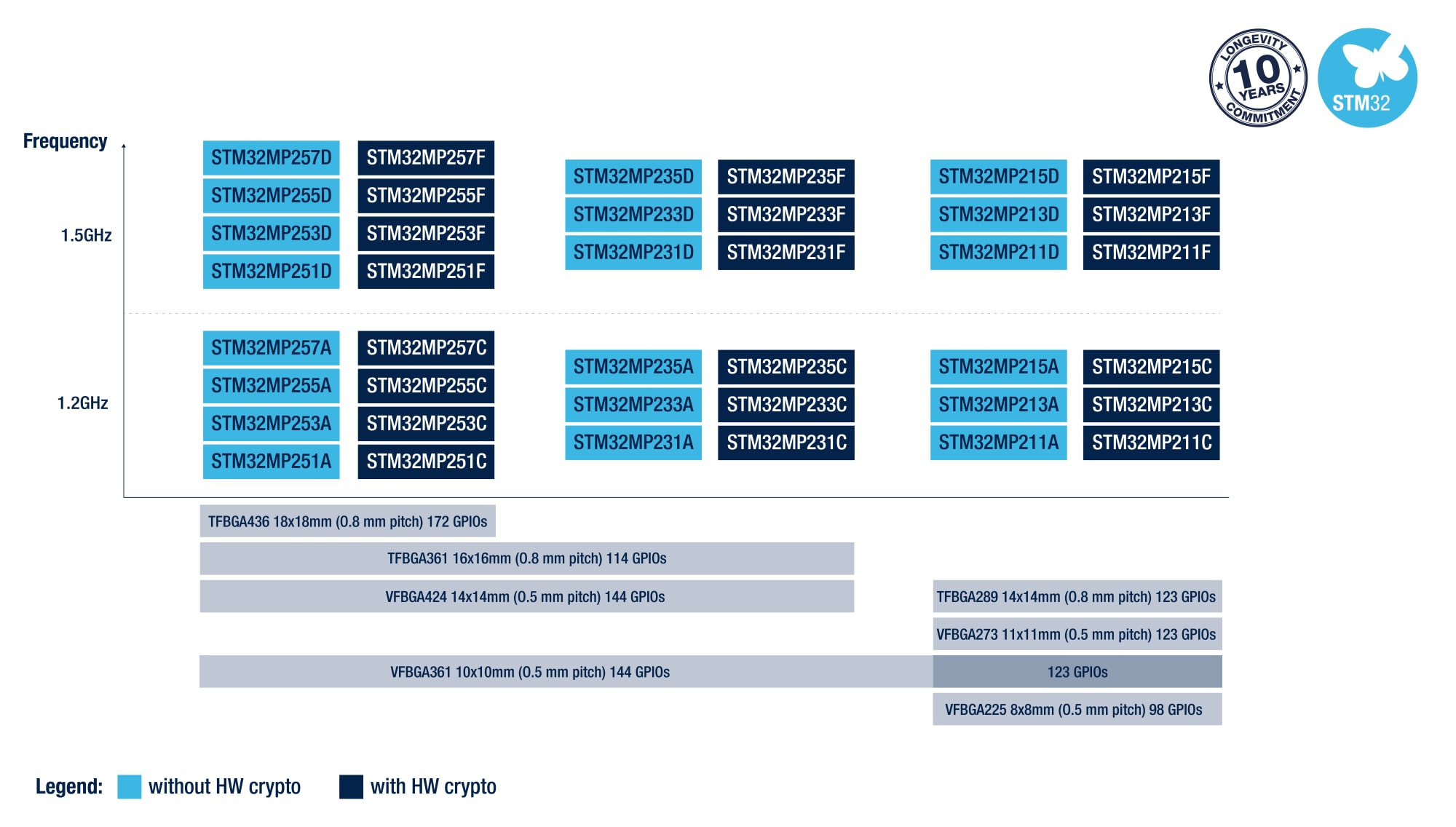 TThe STM32MP2 series offers ten product lines with extensive pin-to-pin compatibility. Each line includes a security option (cryptography and TrustZone® secure boot) and an extended frequency option (Cortex®-A35 up to 1.5 GHz and GPU/NPU up to 900 MHz for STM32MP25x).