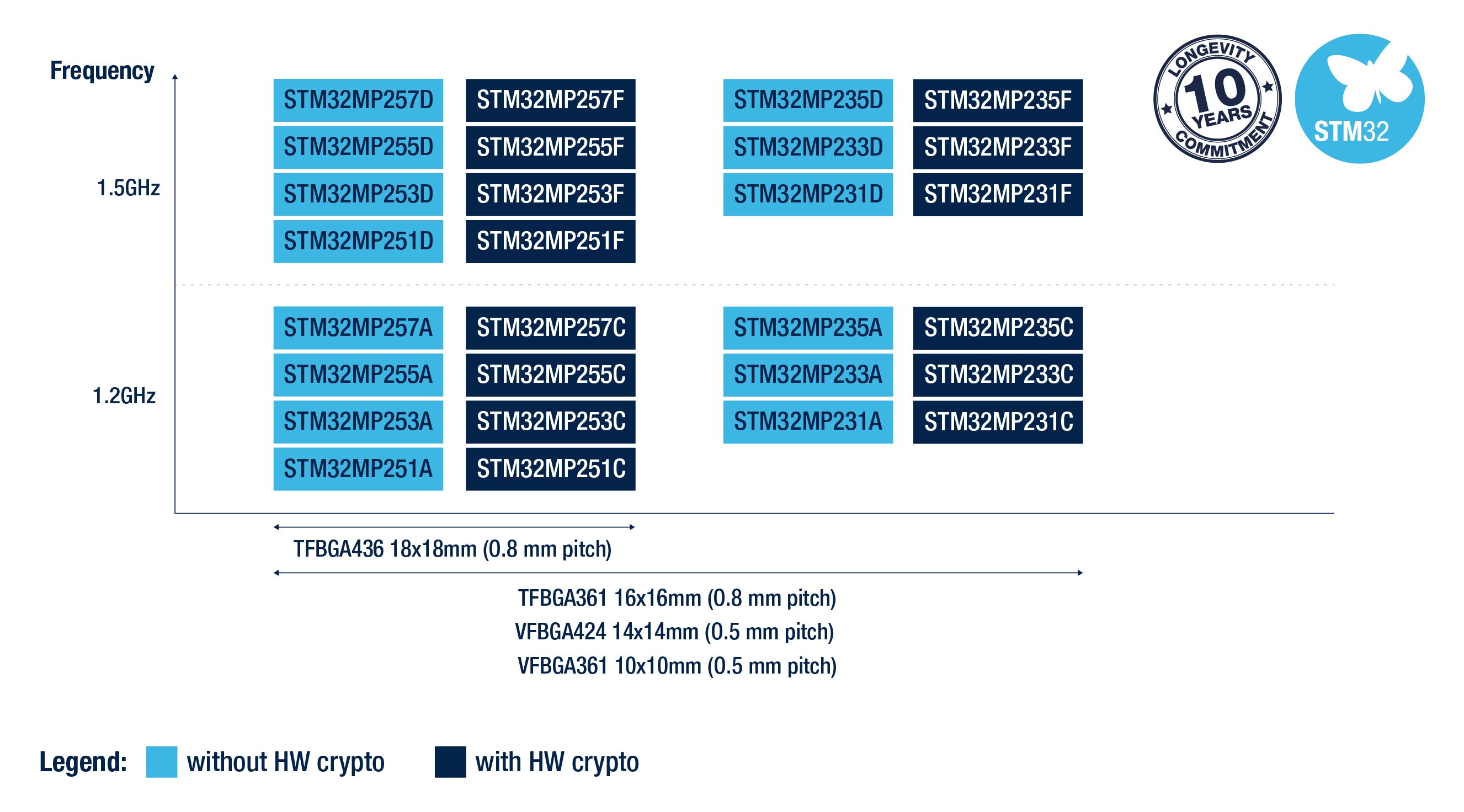 TThe STM32MP2 series offers ten product lines with extensive pin-to-pin compatibility. Each line includes a security option (cryptography and TrustZone® secure boot) and an extended frequency option (Cortex®-A35 up to 1.5 GHz and GPU/NPU up to 900 MHz for STM32MP25x).