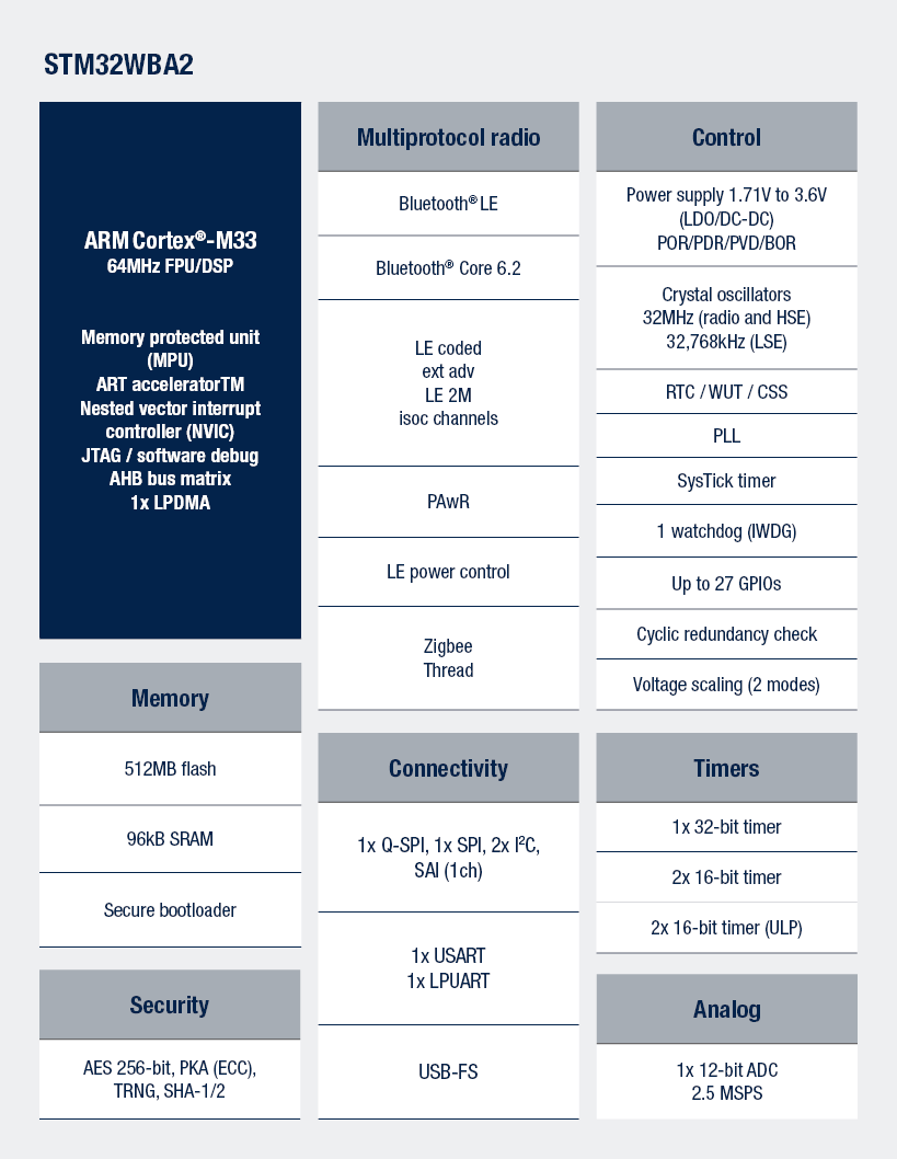 The STM32WBA2xxx multiprotocol wireless and ultra-low-power devices embed a powerful and ultra-low-power 2.4 GHz RADIO compliant with the Bluetooth® LE specifications and with IEEE 802.15.4-2015. They contain a high-performance Arm® Cortex®-M33 32-bit RISC core. They operate at a frequency of up to 64 MHz.