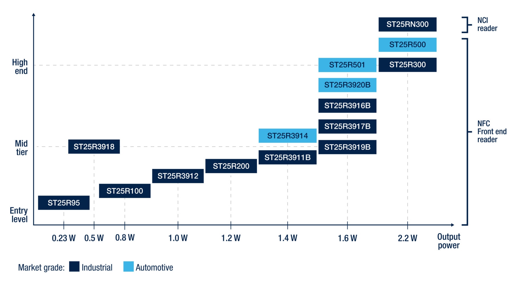 As a leading provider of near field communication (NFC) technology, STMicroelectronics offers a versatile portfolio of NFC readers. The ST25R family includes a large choice of NFC front-end readers and NCI readers (NFC controller interface) designed for embedded applications, such as payment, consumer, industrial, and automotive-grade solutions.