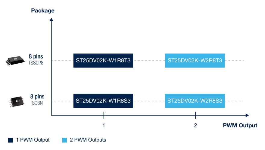The ST25DV-PWM series offers either one or two independent PWM outputs to satisfy numerous use cases. The whole series comes with robust packages options and an extended temperature range by default, to support even the harshest operating conditions.