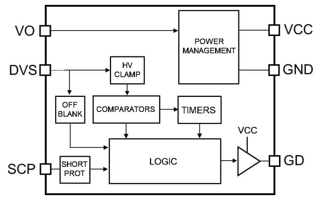 - High-voltage sensing input for SR MOSFET drain-source voltage (190 V AMR)
