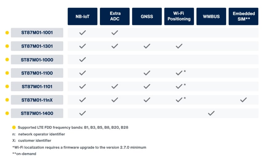 - The ST87M01 is a high-performance, fully programmable, ultra-compact, low-power, LTE Cat-NB2 NB-IoT certified with GNSS positioning offering worldwide bands coverage with advanced security features, suitable for multi-protocol such as wM-Bus as fallback solution .