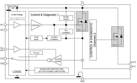 • Diagnostic functionsProportional load current senseHigh-precision current sense for wide currents rangeCurrent sense disableOverload and short to ground (power limitation) indicationThermal shutdown indication