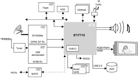 The STi7710 is STMicroelectronics first single chip set-top box decoder for high definition applications, and meets the requirements of all services in the United States, Japan, Australia, as well as the emerging European market.