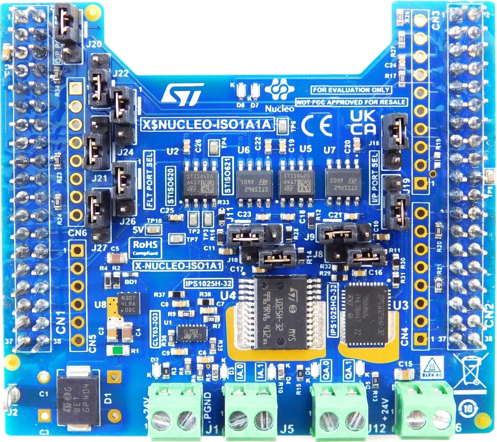 The X-NUCLEO-ISO1A1 is an evaluation board with isolated industrial input/output designed to expand the STM32 Nucleo board and provide micro-PLC functionality.