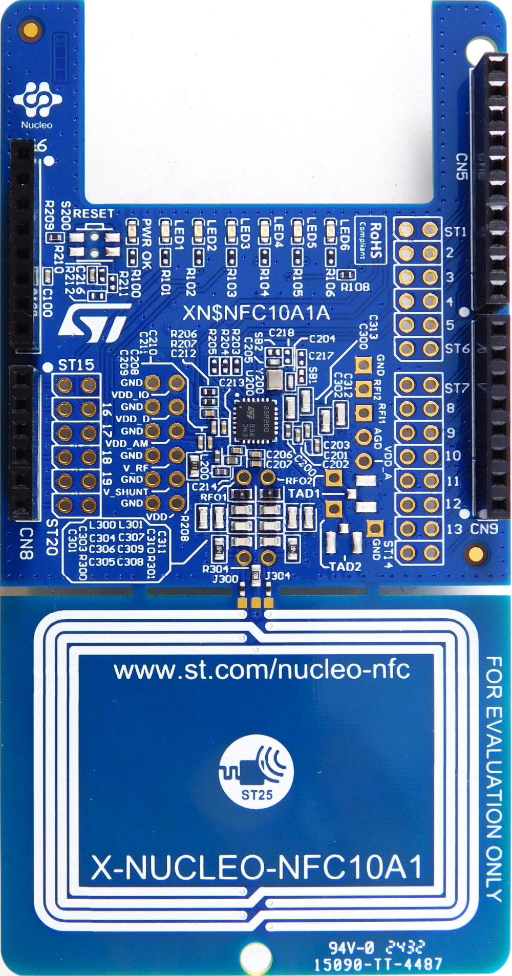 The X-NUCLEO-NFC10A1 NFC card reader expansion board is based on the ST25R200 device.