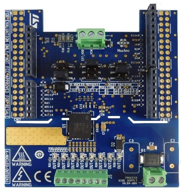 STM32 Nucleoボード向けの産業用デジタル出力拡張ボード「X-NUCLEO-OUT02A1」は、ISO8200AQガルバニック絶縁型オクタル・ハイサイド・スマート・パワー・ソリッド・ステート・リレーをベースにしています。