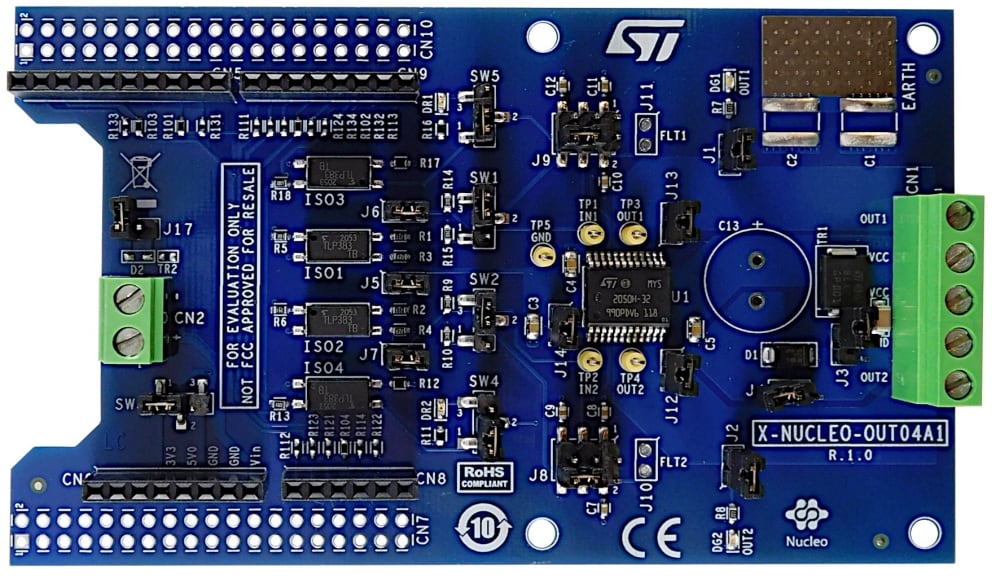 The X-NUCLEO-OUT04A1 industrial digital output expansion board for STM32 Nucleo provides a powerful and flexible environment for the evaluation of the driving and diagnostic capabilities of the IPS2050H-32 (dual high-side smart power solid state relay) in a digital output module connected to 5.7 A (max.) industrial loads.