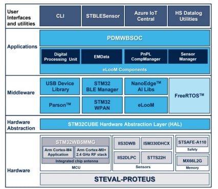FP-AI-PDMWBSOC is an STM32Cube function pack for the STEVAL-PROTEUS1, able to get motion sensor data, process them to make anomaly detection and faults classification, and send the results to the STBLESensor mobile app, a PC terminal console and on Azure IoT central dashboard.