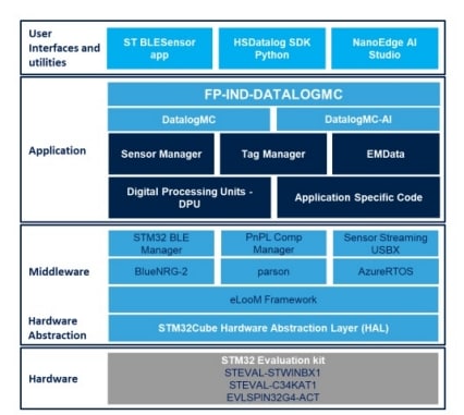 FP-IND-DATALOGMCは、再利用および拡張してカスタム・アプリケーションを構築することができるアプリケーション・レベルのモジュール(SensorManager、TagManager、DPUデジタル処理ユニット)をベースにしています。こうしたモジュール性を実現するために、このファンクション・パックは、eLooMを基盤として構築されています。eLooMは、STM32マイコン用の組込みの軽量オブジェクト指向フレームワークで、STM32マイコンで動作する組込み低消費電力アプリケーションに特化して設計されています。