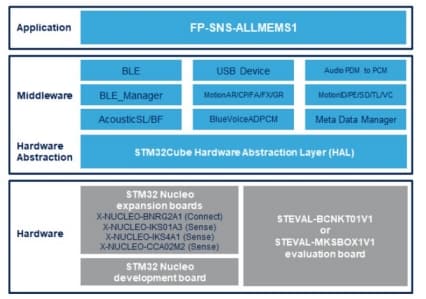 The software runs on the STM32 microcontroller and includes all the necessary drivers to recognize the devices on the STM32 Nucleo development board and expansion boards, as well as on the STEVAL-BCNKT01V1 and STEVAL-MKSBOX1V1.
