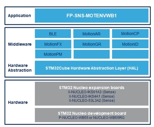 The software runs on the STM32WB microcontroller and includes all the necessary drivers to recognize the devices on the STM32WB55 Nucleo development board (P-NUCLEO-WB55 or NUCLEO-WB55RG), X-NUCLEO-IKS01A3 (or X-NUCLEO-IKS4A1), and X-NUCLEO-53L3A2 (optional) expansion board.