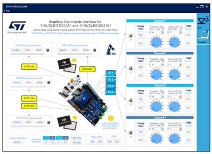 - Full control of the X-NUCLEO-DO40A1 and X-NUCLEO-DO41A1 expansion boards via the STSW-IFAPGUI graphical user interface