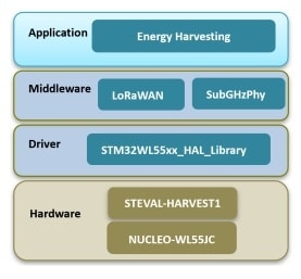 The STSW-HARVEST1 software package provides a complete firmware to build application using LoRa based IC STM32WL55(Mounted on NUCLEO-WL55JC1).