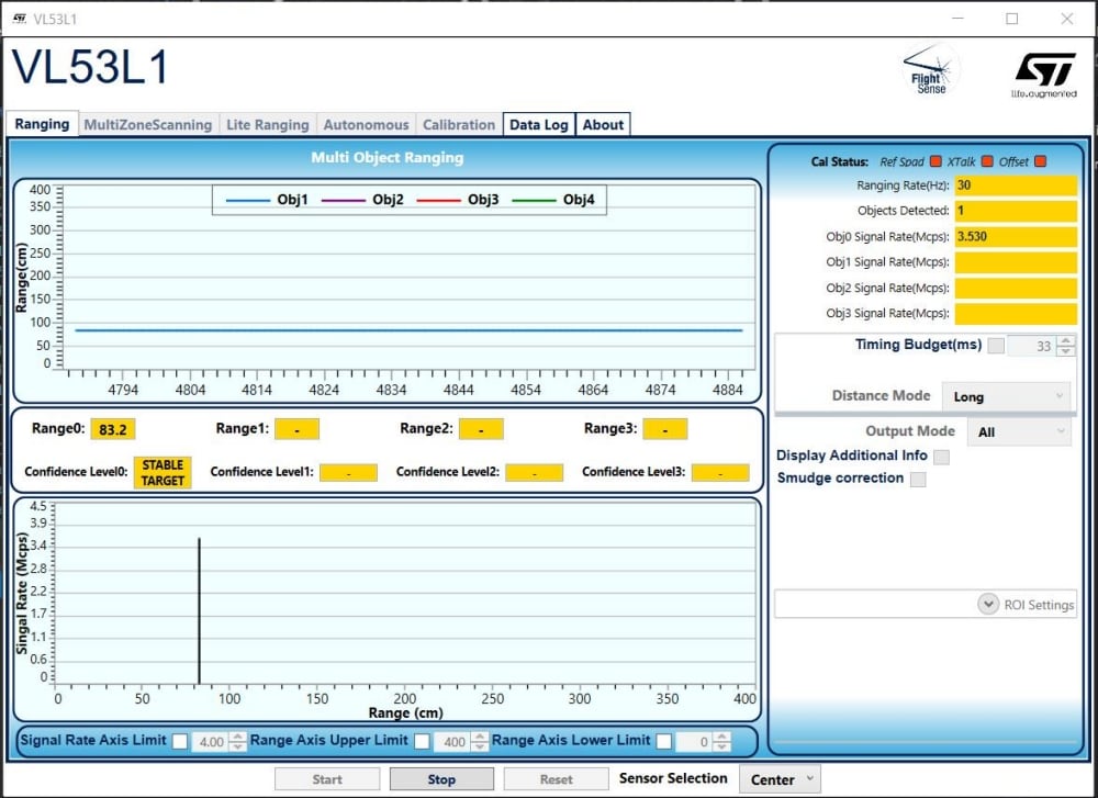 The STSW-IMG020 is a graphical user interface (GUI) for Windows 7 and Windows 10. The GUI controls the P-NUCLEO-53L1A2 pack which consists of the X-NUCLEO-53L1A2 expansion board connected to the STM32F401RE nucleo board.