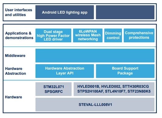 The firmware consists of two .bin files, one running on the DCU and one running on the STM32L071KZ microcontroller embedded on the STEVAL-LLL008V1 evaluation board, featuring the HVLED001B high brightness LED driver.