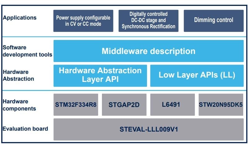 The firmware is based on libraries generated from STM32CubeMX on the STM32F334R8T6 high performance 32-bit ARM® Cortex®-M4 microcontroller and controls the DC-DC half bridge LCC resonant converter and the output synchronous rectification.