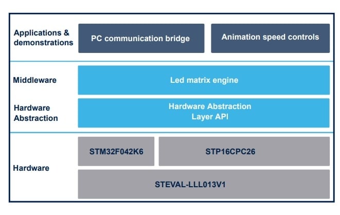The STSW-LLL013FW firmware implementation is based on the 32-bit STM32F042K6 microcontroller, allowing configuration and control of the two STP16CPC26 LED drivers over a SPI interface.