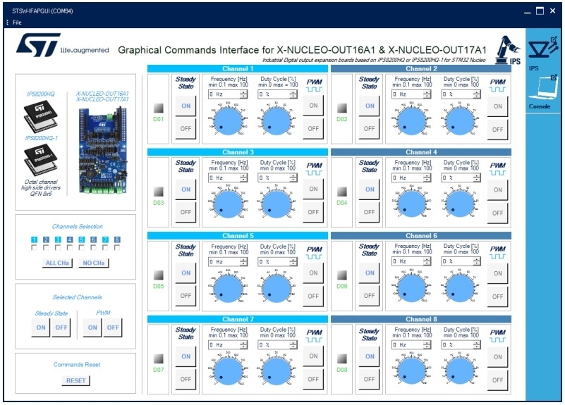 - Full control of the X-NUCLEO-OUT16A1 and X-NUCLEO-OUT17A1 expansion boards via the STSW-IFAPGUI graphical user interface
