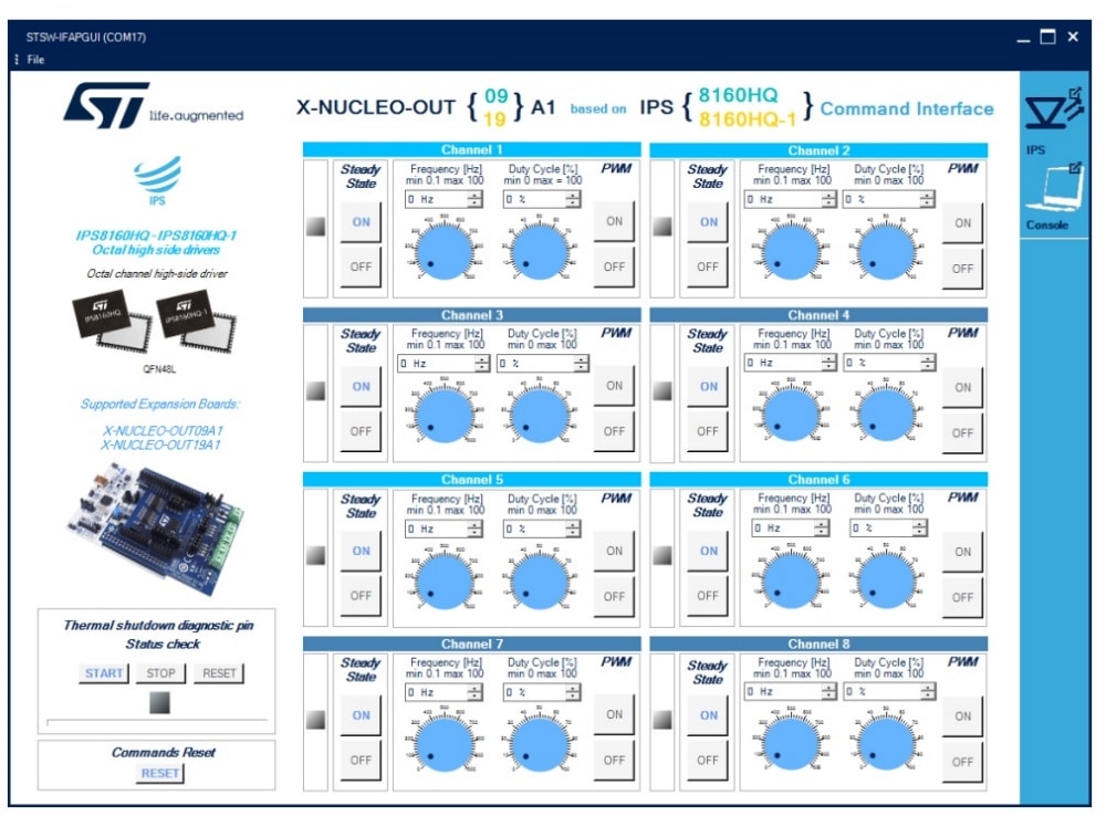 - Full control of the X-NUCLEO-OUT09A1 and X-NUCLEO-OUT19A1 expansion boards via the STSW-IFAPGUI graphical user interface