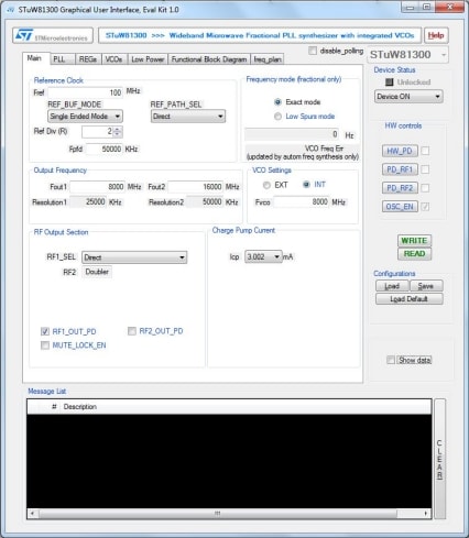 PC-compatible software with a graphical user interface (STSW-RFSOL003) allows the user to write and read all device registers. It can be downloaded from www.st.com. This gives direct control of circuit functions such as: operating frequency, reference frequency, input mode, charge pump current and low-power modes.