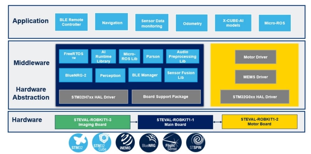 The STSW-ROBKIT1 software package includes two modular firmware components. One is designed for the main board, which operates at a CPU clock frequency of up to 550MHz, enabling high-performance processing. The other is tailored for the motor control board, ensuring motor control applications.
