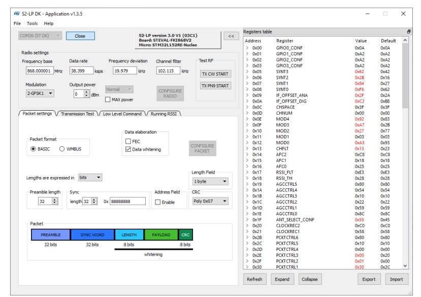 The S2-LP_DK GUI application provides an interactive PC interface for the registers on the S2-LP. Its main function is to configure the analog radio section and the packet handler in a user friendly manner for the most common applications.