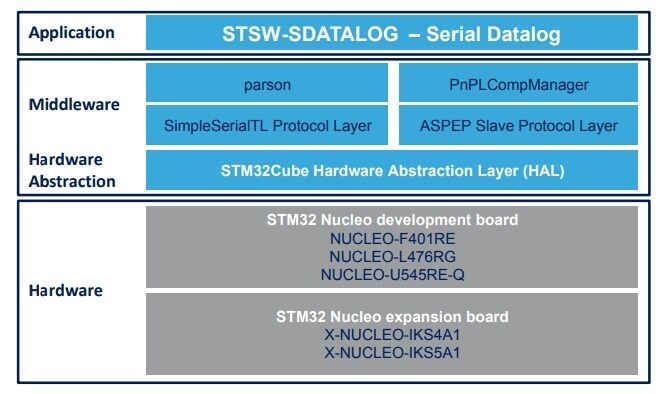 The STSW-SDATALOG contains examples for NUCLEO-F401RE, NUCLEO-L476RG, and NUCLEO-U545RE-Q with X-NUCLEO-IKS4A1 and X-NUCLEO-IKS5A1.