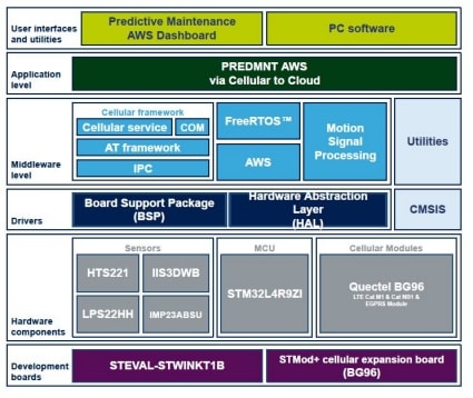 The firmware runs on the STEVAL-STWINKT1B SensorTile Wireless Industrial Node development kit MCU (STM32L4R9ZIJ6), and requires the additional STMod+ cellular expansion board featuring the BG96 modem by Quectel (LTE Cat M1/NB-IoT/2G fallback).